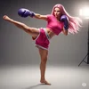 Gear: purple/ pink boxing gloves, pink T-shirt and pink shorts