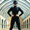 Gear: black matte catsuit (with zipper in the back or front), black balaclava hood, black opaque visor, barefoot