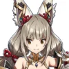 As a Blade, Nia drops her feline mannerisms and appears more visually similar to a kitsune. She retains her facial markings, eyes, and elongated canines from her Driver form. Her hair now comes down to her legs and is styled into very low twintails tied up with red shimenawa-like rope. Her ears are now much longer, point upwards and outwards, and are decorated around the base. Her clothing resembles a miko outfit, which consists of a white gold-and-red trimmed leotard, with her Core Crystal - shaped like an upside down blue geometric kite with red blotches from being a Flesh Eater - visible on her chest, and matching large detached sleeves with white gloves. Both the leotard and sleeves are adorned with red rope with the former decorated with gold-colored bells. Her boots are now red with large gold spikes on the toe caps, with gold-trimmed white thigh-high leggings. Her default Catalyst Scimitar is a long blue blade with flowers running along it, with a guarded golden hilt.