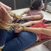 Slutty_Sasha: While you are laying on the matt with your ass up and chest down i attempt to grab your both arms and your legs together hope to put you into hogtied pose