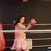 <MuayThaiFera> I head into the corridor and make my walk to the entrance ramp, wearing my hot pink poncho, hot pink and black lined fight skirt, sky blue 8oz regulation gloves and a pink and black armband on my left arm tied around my bicep. My arms are visible either side of my silky fight poncho. I bounce a little in my sliders as I head to the curtain and get told "3... 2... 1" and get a nod. My music hits and I walk out to a decent sized little arena with around 1,500 in the audience, smoke machines either side of the ramp and strobe lights. TV cameras focus on me as I walk the catwalk style ramp which is level with the ring. I look like business with my jet black hair tied tight in a long, braided ponytail down my back, hanging down between my shoulder blades. I look a little shiny in the lights from my very light massage pre fight, almost glistening in the lights.