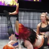 Madame_Mercy: On my hands and knees, giving my lips a good lick as I start picking my way back up to my feet. I walk over, staring down at you and taking my sweet time to come up with a finish for someone like you. "Looks like you're used to being that position, huh!" I giggle as I bend down and give your propped up booty cheeks a quick little spank. "Wakey, wakey Kayla! We're not done just yet!" I say as I once again reach for your head, locking my hands inside your hair and pulling you up towards my thighs. Trying to tuck your head down between, bending you over once more for the crowd before wrapping my arms around your waist and attempting to carry you up-side down into the air.