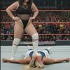Anastasia_the_brawler: I push you with my hands on your shoulders to make you roll on your back! I sit on your chest smiling and giving some slaps to your face to humiliate you a bit ! Then I catch one of your legs and pull it high ! Crowd counting 1......2 and i let fall your leg and stand up! "One move and down... you are a weak fat cow really!"