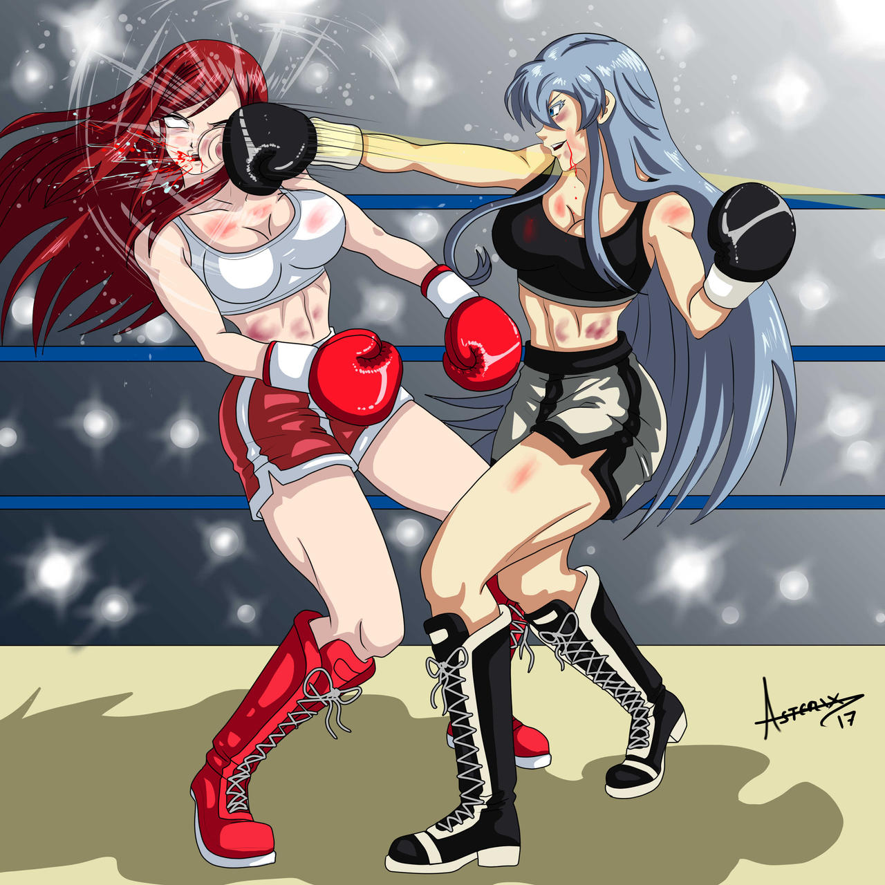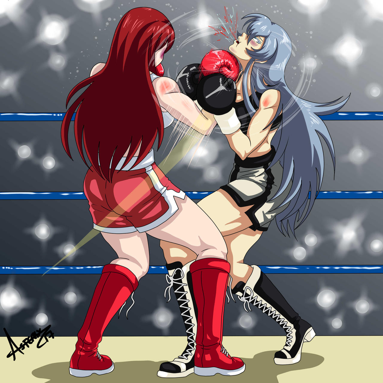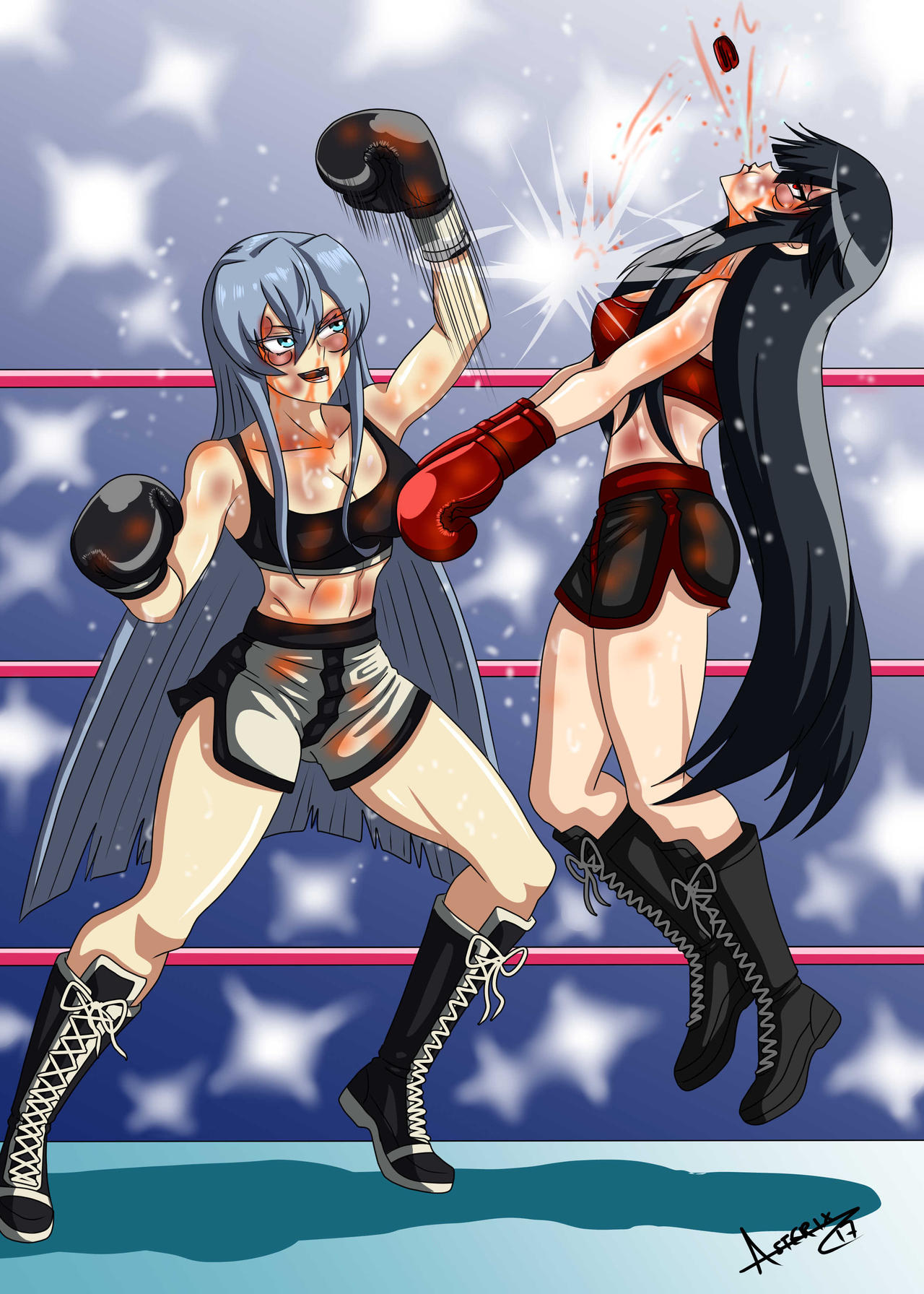 Brunhilde(Edeath): Whenever someone loses balance during a boxing match it means that they experienced a concussion, something that usually connects well with a knockdown. Right in this moment of vulnerability a boxer is usually open, vulnerable to what his or her opponent has to offer and well, the most obvious thing to do is to seek to survive. This is not what Esdeath has in mind, nor in her heart. She's a fierce warrior and there is no place for weakness in her heart, she does what she does best: kicking ass. With a swift and powerful punch she sends you back, knocking some senses back into your brain and well, of course she goes in for the offensive even if she was struck twice both to the chin and to the jaw. Esdeath grins her teeth, with her leathers up to her face she starts a barrage of quick attacks: a right and a left jab both at your face, then a shovel hook to the pit of your stomach.. finishing the combination as she ducks down and slips to the lrft-forward, in an oblique manner to catch your stomach with a powerful right uppercut that will sink deep into your organs.