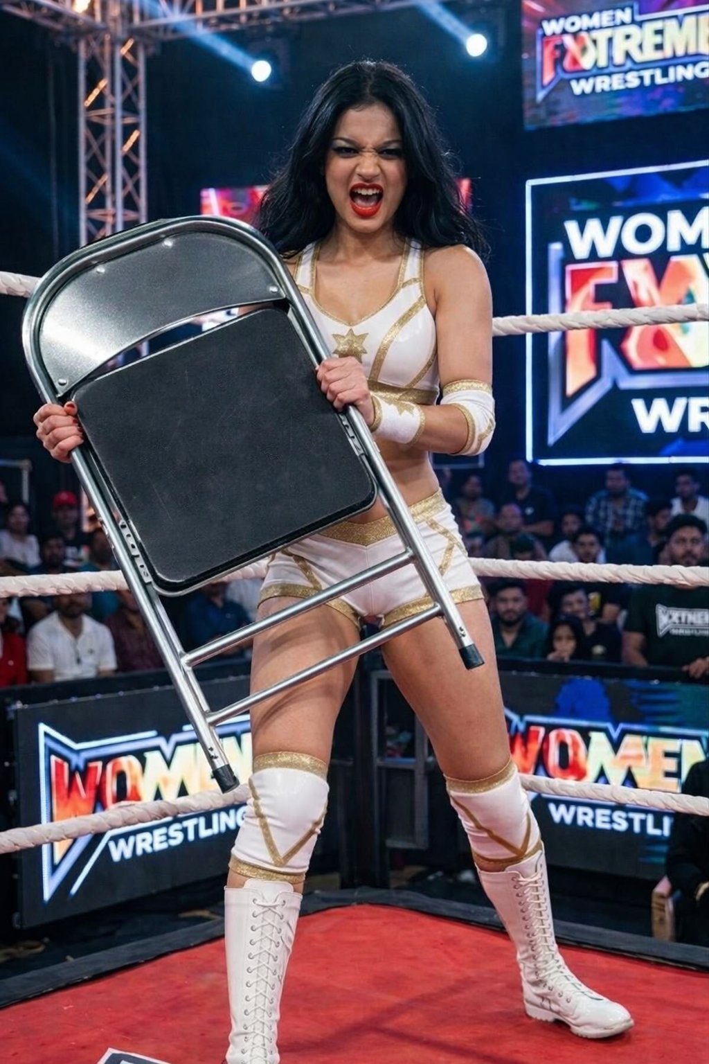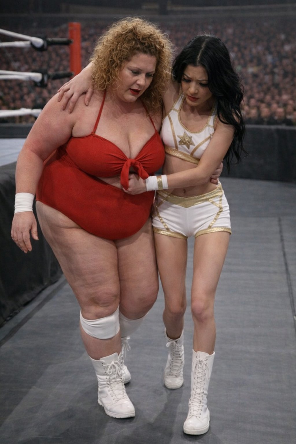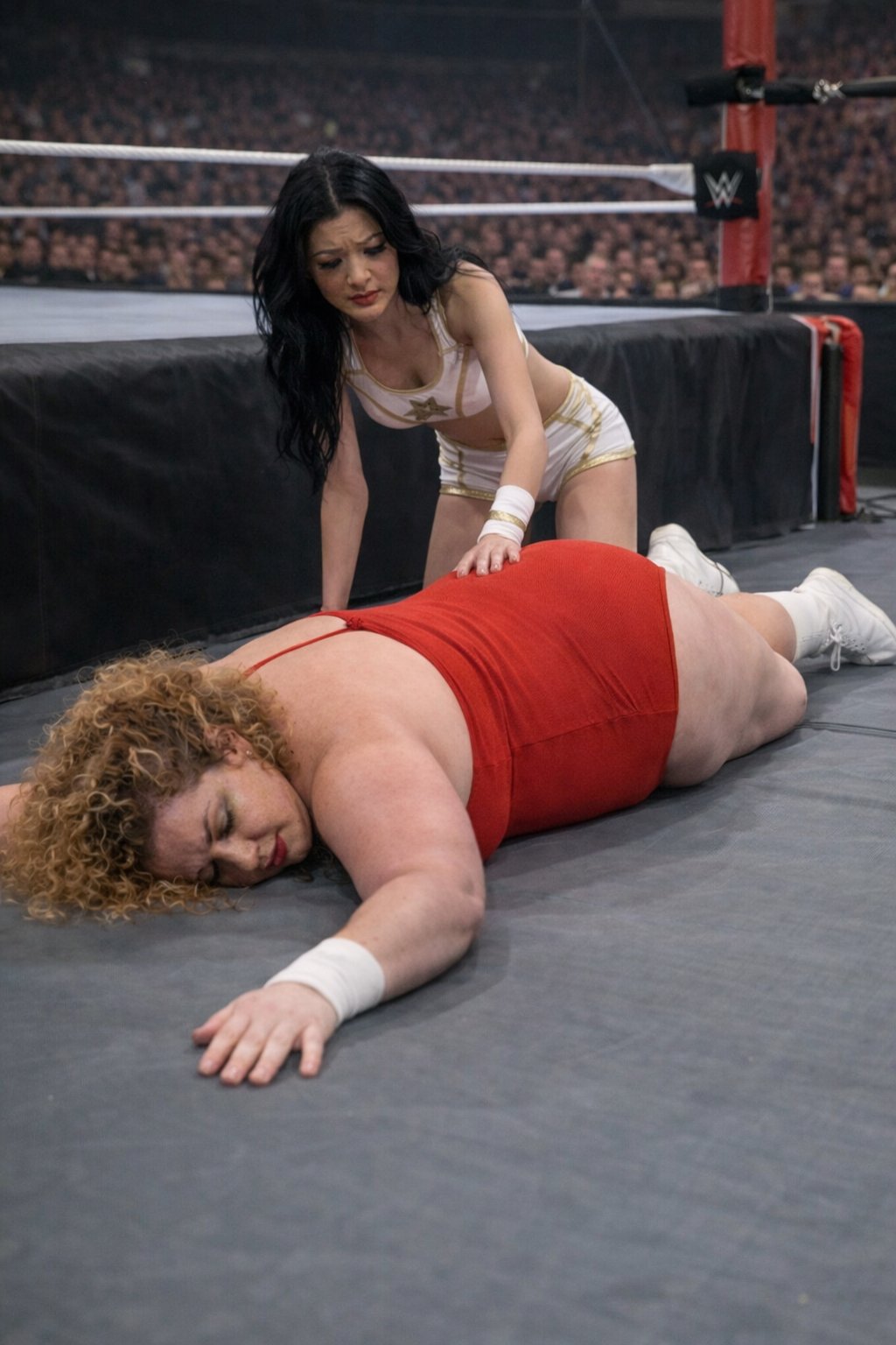 SkinnybitchAditi: I stay frozen for a second even after she backs off… my arms still raised with the chair, breathing fast, eyes locked where she stood… waiting… just in case she rushes back… But she doesn’t… The second she disappears backstage; my grip loosens and the chair slips from my hands with a loud clang onto the floor… “Beckie…!” I drop to my knees beside her immediately, my hands hovering for a moment, unsure where to even touch without hurting her more… she’s sprawled out, barely moving… “hey… hey… can you hear me…?” My voice is soft now… shaky… completely different from a second ago… I gently slide one hand under her shoulder, the other brushing her hair away from her face, trying to see her eyes… “You’re okay… I’ve got you… she’s gone… she’s gone…” I swallow hard, looking around quickly and waving frantically toward the back… “Ref! Someone.....get out here! Now!” My hand rests lightly against her cheek, tapping gently, trying to keep her awake… “Don’t… don’t go out on me, okay…? Stay with me… please…” I shift closer, almost shielding her instinctively now, my small frame curled protectively beside her as I keep talking softly, trying to ground her… “I’m right here… I’m not letting anything happen to you…”