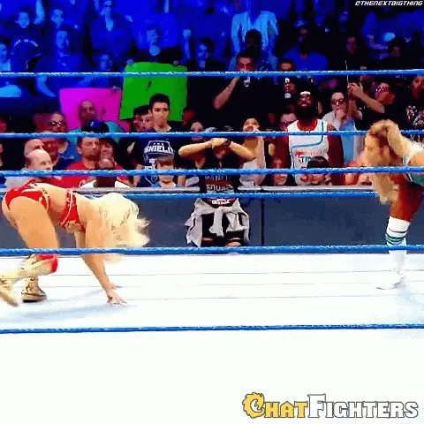 Wrestlinglinda: I get up to my feet and raise my arms extending my fingers and closing them cheerleading for the crowd and getting them to yell and cheer louder and louder. As I wave them on I wait for you to rise up to your feet in the corner and then I charge after you, leaping into the air, and extending my boots aiming them at your massive chest.