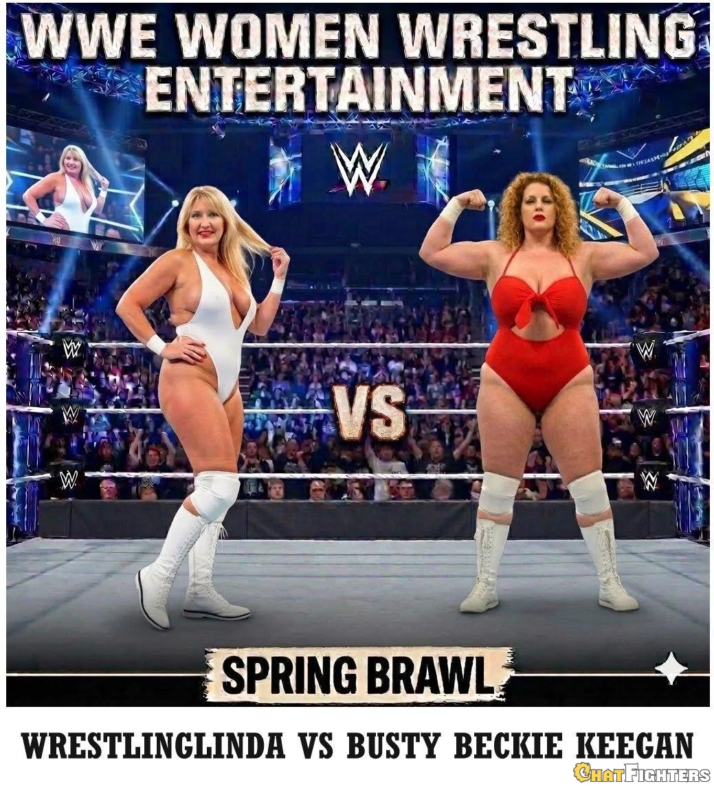 Busty_Beckie_Keegan: We circle for a moment or two, then you raise your arms for a collar and elbow lock-up, I let out a grin and follow your motion, raising my arms. You engage and immediately spread your legs and start grunting as you try to force me back, I brace my thick legs, my powerful thighs bulging as I initially resist your efforts and then...I start to push myself, I have nearly 50lbs on you and your... resistance is futile... you start backpedalling until your back hits the ropes... "Break... break!" the referee yells as I lean on you and push you backwards into the ropes causing them to bow outwards... "Okay... okay..." I grudgingly reply to the ref. I raise my arms for a clean break and then... just as the ropes push you back into the ring, I drop my right arm and fire my right hand in a knife edge chop across your chest...