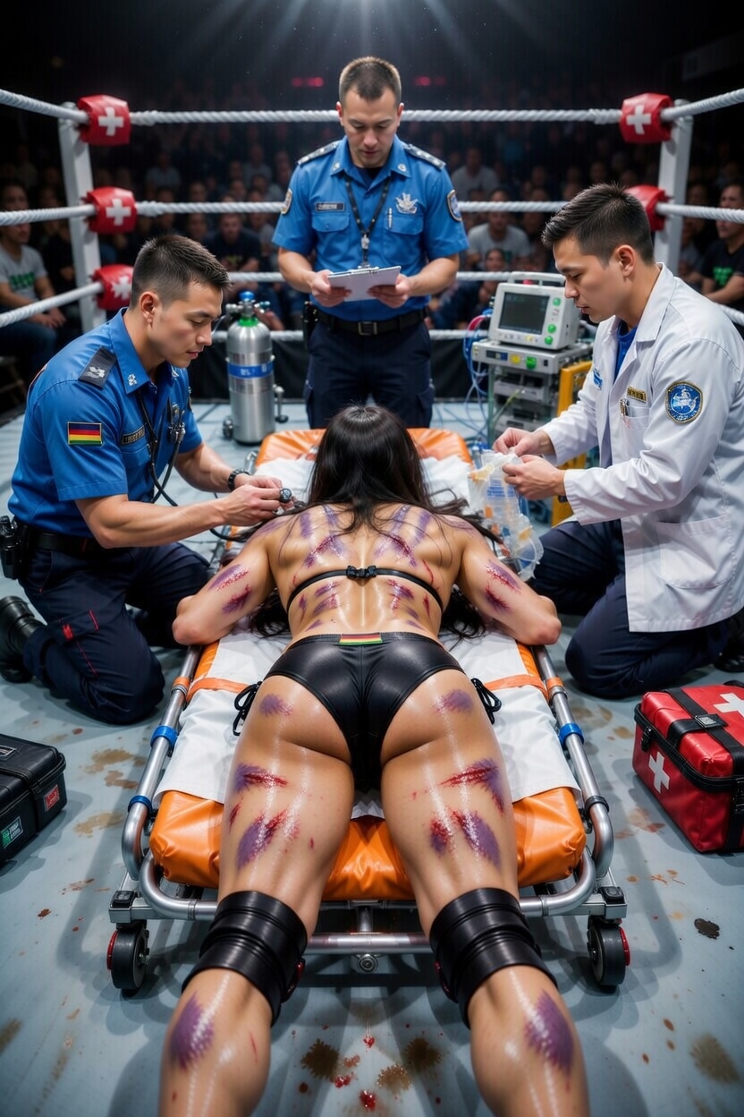 Luisa_the_dark_queen: The medical unit removes the barb wire from my head! I fall on my side! Slowly rolling face to the mat... they pull me slowly on a stretcher to drive me away as the crowd cheers for Beckie