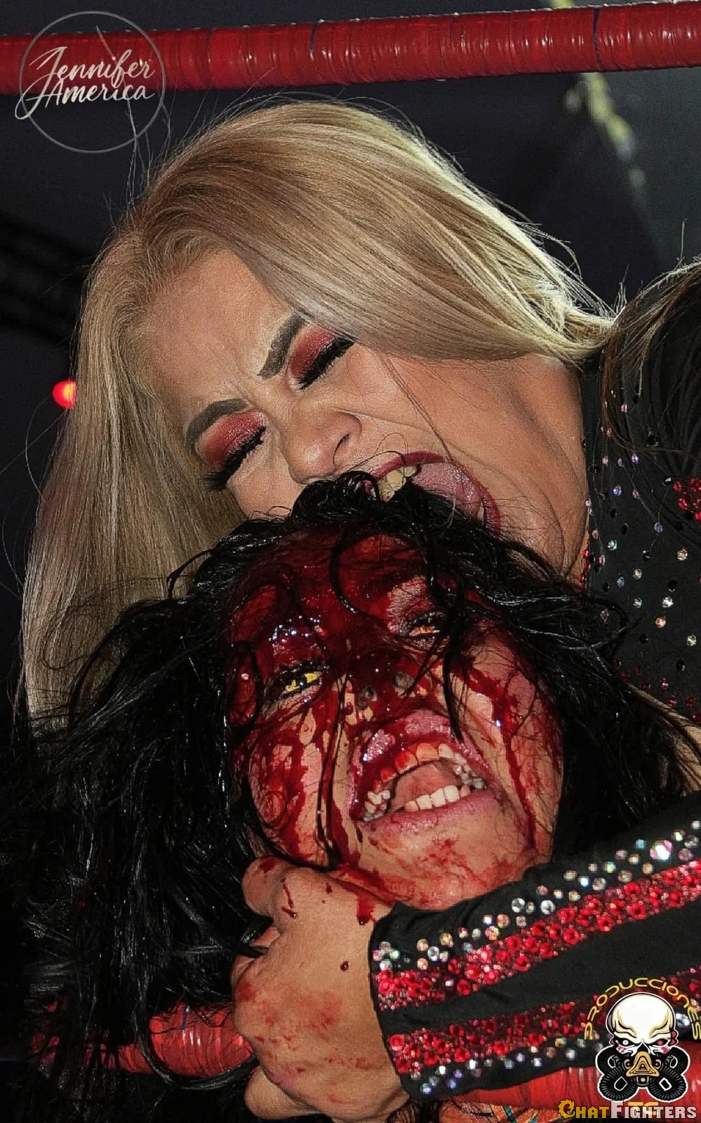 Luisa_the_dark_queen: You pull me by my hair to the corner! My way to walk shows that I am out of conditions! My face bleeding badly as my lower abs is... you slam me back first against the corner... I place my arms over the top ropes... each time I breath blood flows on my chin and chest!