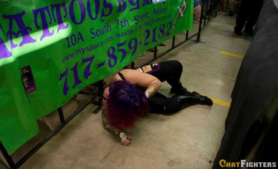 Luisa_the_dark_queen: "F... fuck you old fat cow!!!" I answered to you before you lift me up, upside down and smashes my back hard on the concrete floor! I bend my back and scream in pain "AAAAAAAAAAAAAAAAAAAAAAAAAAAAAAAAAH !!!!!!!!!!!!!" I roll face to the mat and crawl quickly! My upper body disappear under the ring skirt as I search something with my hands to make you pay back.